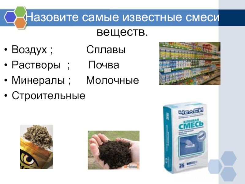Слайд 15Назовите самые известные смеси веществ.