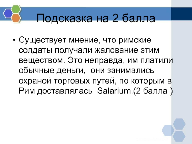 веществом. Это неправда, им платили обычные деньги, они занимались охраной торговых путей, по которым в Рим доставлялась Salarium.(2 балла )