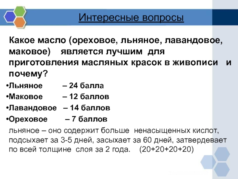 льняное – оно содержит больше ненасыщенных кислот, подсыхает за 3-5 дней, засыхает за 60 дней, затвердевает по всей толщине слоя за 2 года. (20+20+20+20)
