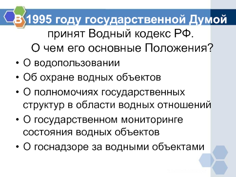 Слайд 17В 1995 году государственной Думой принят Водный кодекс РФ.