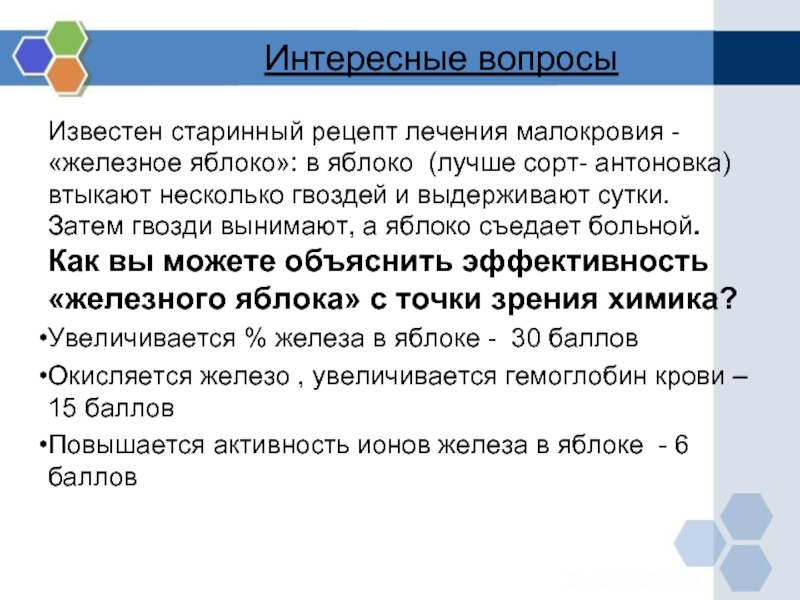 яблоко (лучше сорт- антоновка) втыкают несколько гвоздей и выдерживают сутки. Затем гвозди вынимают, а яблоко съедает больной. Как вы можете объяснить эффективность «железного яблока» с точки зрения химика?