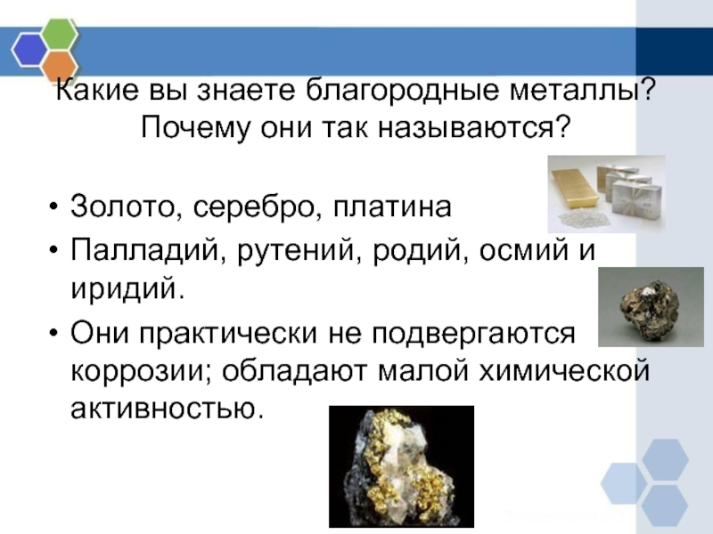 Слайд 13Какие вы знаете благородные металлы? Почему они так называются?