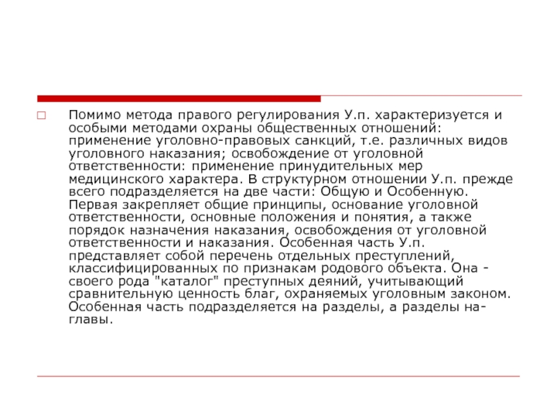 отношений: применение уголовно-правовых санкций, т.е. различных видов уголовного наказания; освобождение от уголовной ответственности: применение принудительных мер медицинского характера. В структурном отношении У.п. прежде всего подразделяется на две части: Общую и Особенную. Первая закрепляет общие принципы, основание уголовной ответственности, основные положения и понятия, а также порядок назначения наказания, освобождения от уголовной ответственности и наказания. Особенная часть У.п. представляет собой перечень отдельных преступлений, классифицированных по признакам родового объекта. Она - своего рода "каталог" преступных деяний, учитывающий сравнительную ценность благ, охраняемых уголовным законом. Особенная часть подразделяется на разделы, а разделы на- главы.