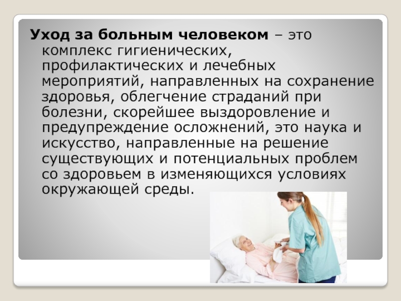 Слайд 2Уход за больным человеком – это комплекс гигиенических, профилактических и лечебных мероприятий,