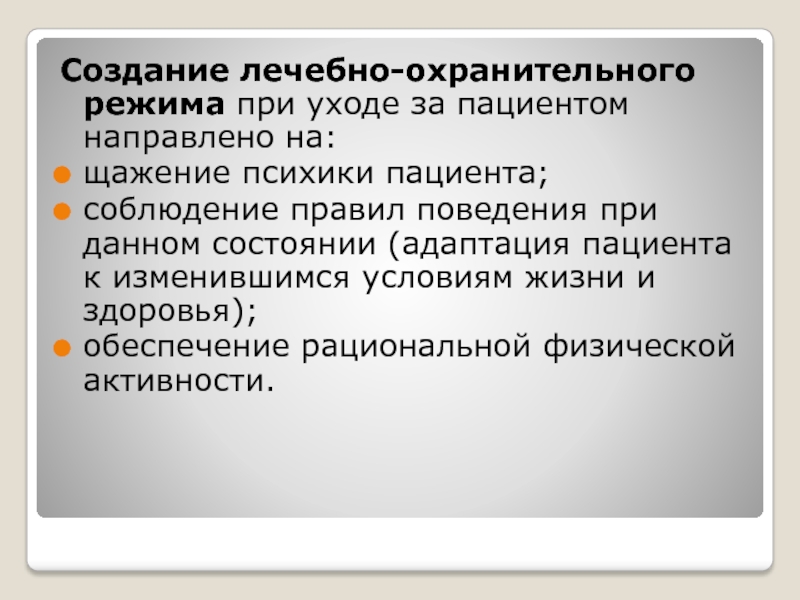 Слайд 4Создание лечебно-охранительного режима при уходе за пациентом направлено на: