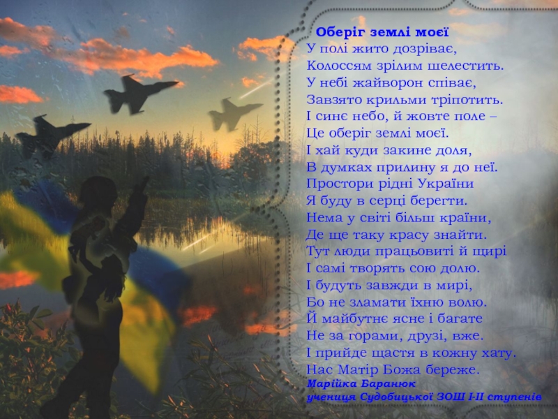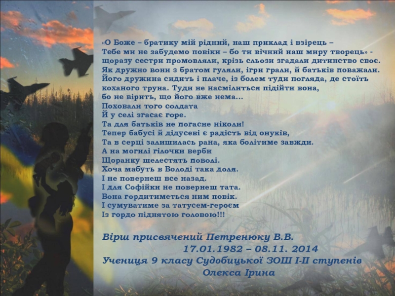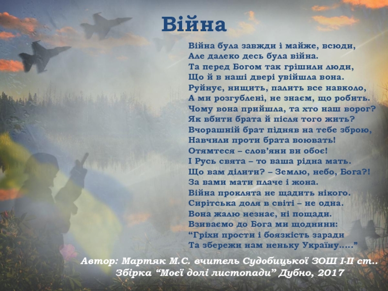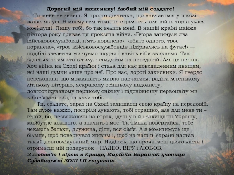Ти мене не знаєш. Я просто дівчинка, що навчається у школі, живе, як усі. В моєму селі тихо, не стріляють, але війна торкнулася моєї душі. Пишу тобі, бо так велить мені. В нашій країні майже півтора року триває ця проклята війна. «Вчора загинули два військовослужбовці, п’ять поранено», «вбито одного, троє поранено», «троє військовослужбовців підірвались на фугасі» —подібні зведення ми чуємо щодня і навіть ніби звикаємо. Так здається і тим хто в тилу, і солдатам на передовій. Але це не так. Хоч війна на Сході країни і стала для нас повсякденним явищем, всі наші думки лише про неї. Про вас, дорогі захисники. Я твердо переконана, що можливість мирно навчатися, радіти легенькому літньому вітерцю, яскравому осінньому падолисту, довгоочікуваному першому сніжку і підсніжнику-первоцвіту ми зобов’язані тобі, і тільки тобі.