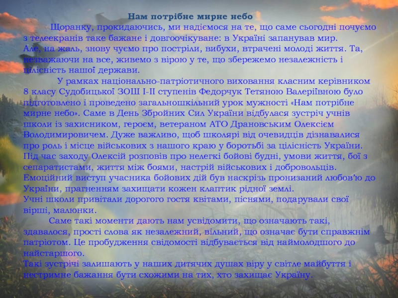У рамках національно-патріотичного виховання класним керівником 8 класу Судобицької ЗОШ I-II ступенів Федорчук Тетяною Валеріївною було підготовлено і проведено загальношкільний урок мужності «Нам потрібне мирне небо». Саме в День Збройних Сил України відбулася зустріч учнів школи із захисником, героєм, ветераном АТО Драновським Олексієм Володимировичем. Дуже важливо, щоб школярі від очевидців дізнавалися про роль і місце військових з нашого краю у боротьбі за цілісність України. Під час заходу Олексій розповів про нелегкі бойові будні, умови життя, бої з сепаратистами, життя між боями, настрій військових і добровольців. Емоційний виступ учасника бойових дій був наскрізь пронизаний любов’ю до України, прагненням захищати кожен клаптик рідної землі.