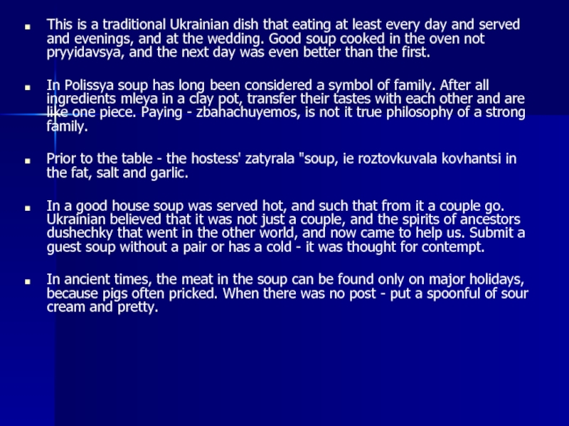 In a good house soup was served hot, and such that from it a couple go. Ukrainian believed that it was not just a couple, and the spirits of ancestors dushechky that went in the other world, and now came to help us. Submit a guest soup without a pair or has a cold - it was thought for contempt.