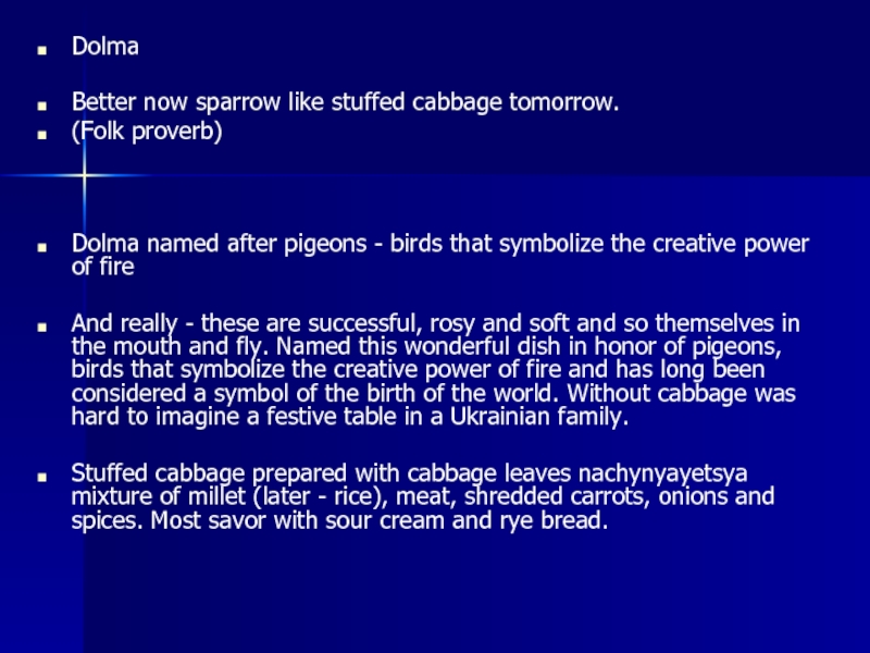 Stuffed cabbage prepared with cabbage leaves nachynyayetsya mixture of millet (later - rice), meat, shredded carrots, onions and spices. Most savor with sour cream and rye bread.
