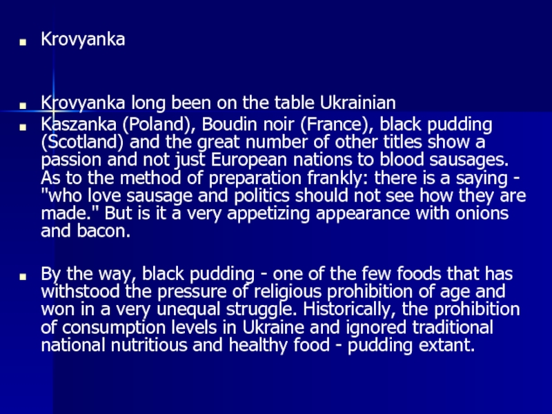 By the way, black pudding - one of the few foods that has withstood the pressure of religious prohibition of age and won in a very unequal struggle. Historically, the prohibition of consumption levels in Ukraine and ignored traditional national nutritious and healthy food - pudding extant.