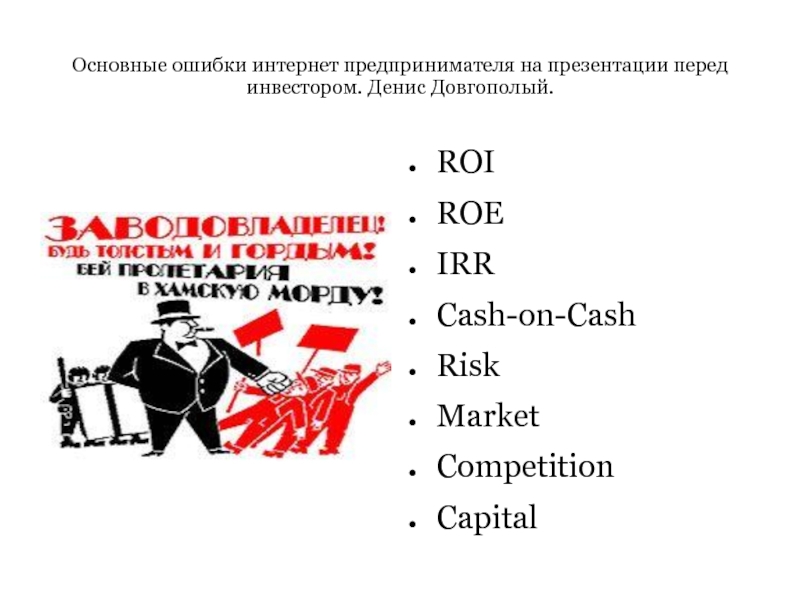 Слайд 5Основные ошибки интернет предпринимателя на презентации перед инвестором. Денис Довгополый.