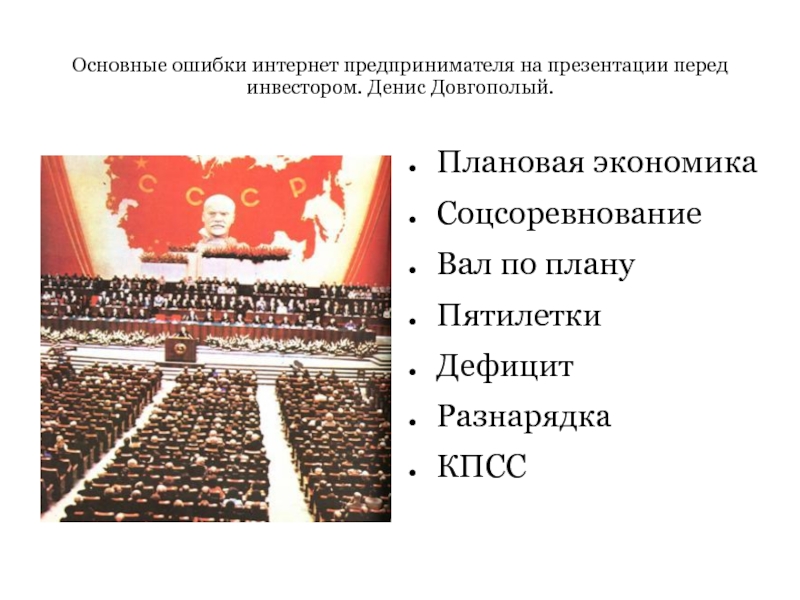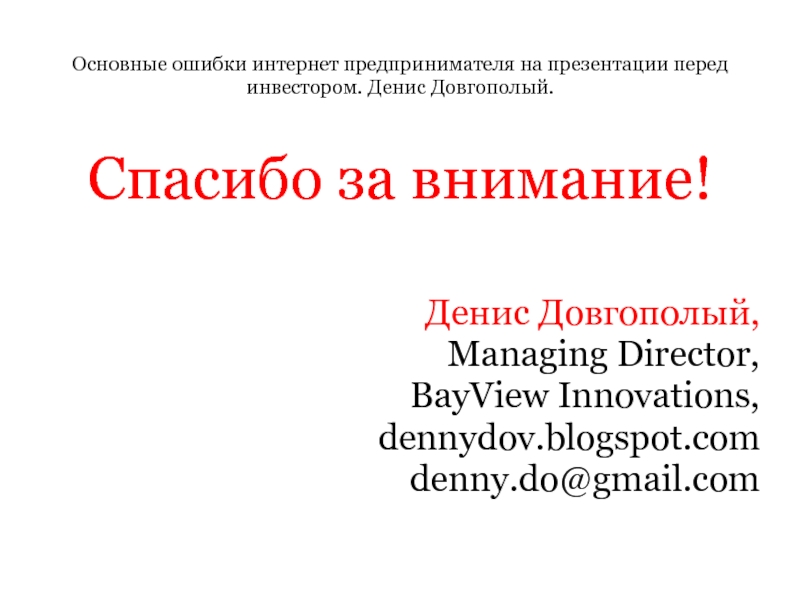Слайд 9Основные ошибки интернет предпринимателя на презентации перед инвестором. Денис Довгополый.
