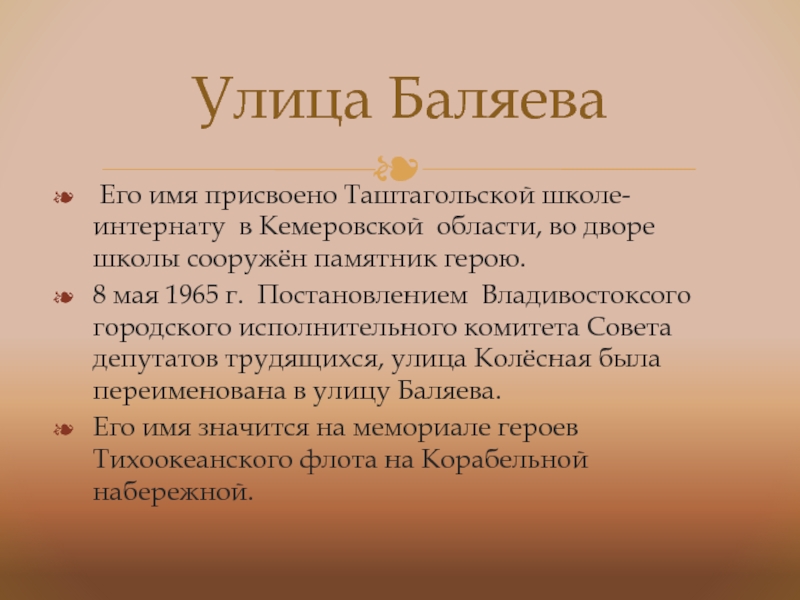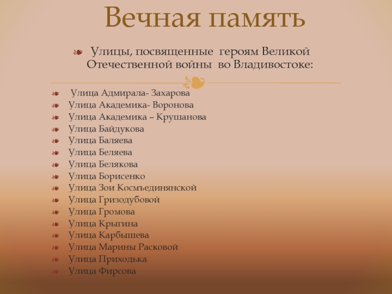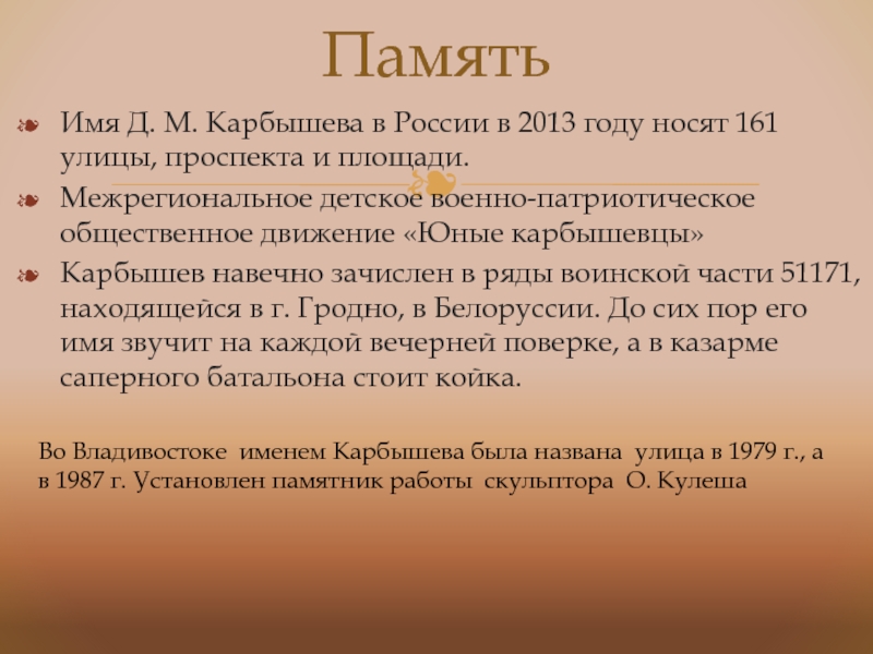 Во Владивостоке именем Карбышева была названа улица в 1979 г., а в 1987 г. Установлен памятник работы скульптора О. Кулеша