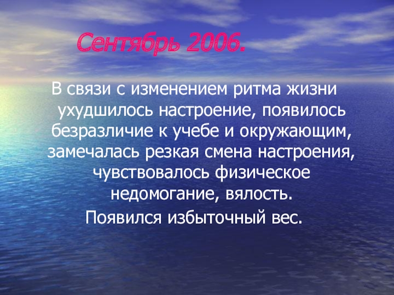 ухудшилось настроение, появилось безразличие к учебе и окружающим, замечалась резкая смена настроения, чувствовалось физическое недомогание, вялость.