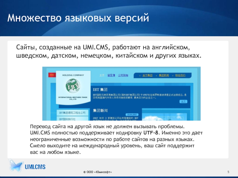 Перевод сайта на другой язык не должен вызывать проблемы. UMI.CMS полностью поддерживает кодировку UTF-8. Именно это дает неограниченные возможности по работе сайтов на разных языках. Смело выходите на международный уровень, ваш сайт поддержит вас на любом языке.