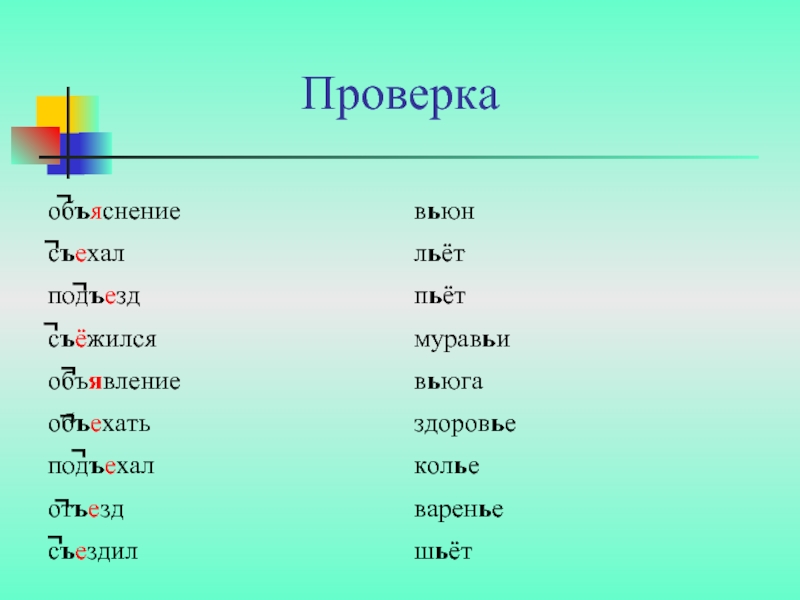 Об…яснение, с…ехал, в…юн, под…езд, л…ёт, п…ют, с…ёжился, мурав…и, об…явление, об…ехать, в…юга, под…ехал, от…езд, здоров…е, кол…е, варен…е, ш…ёт, с…ездил.