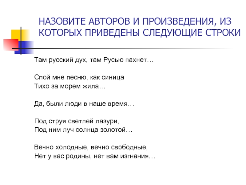 Слайд 2НАЗОВИТЕ АВТОРОВ И ПРОИЗВЕДЕНИЯ, ИЗ КОТОРЫХ ПРИВЕДЕНЫ СЛЕДУЮЩИЕ СТРОКИ