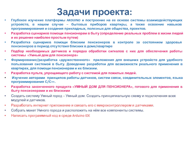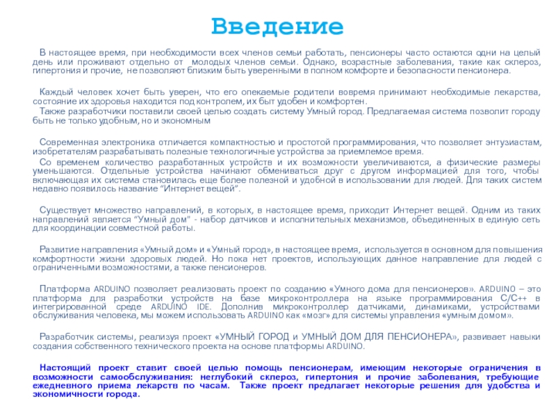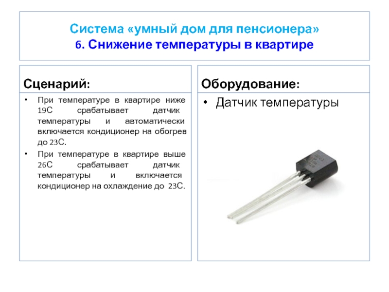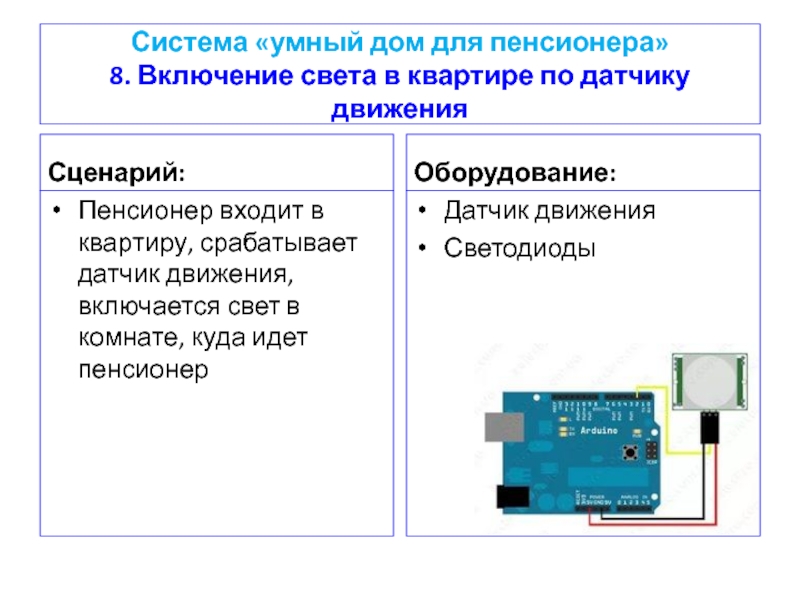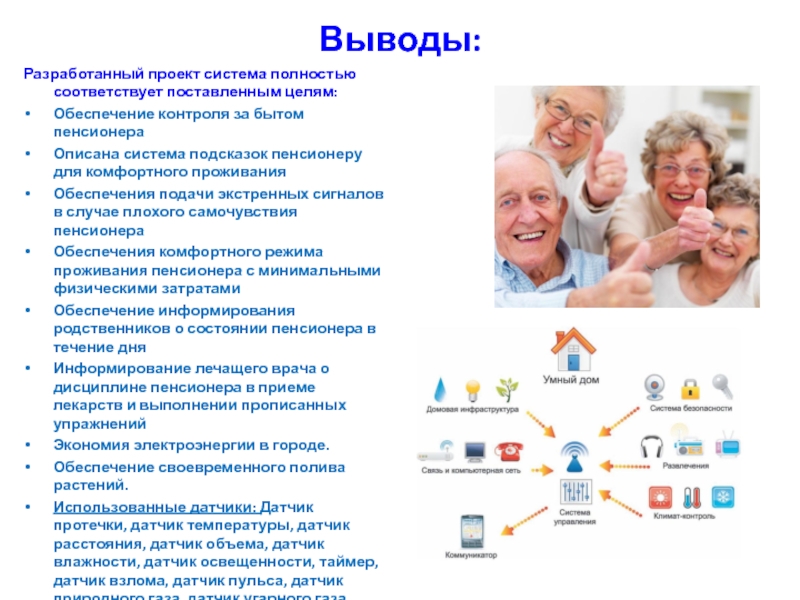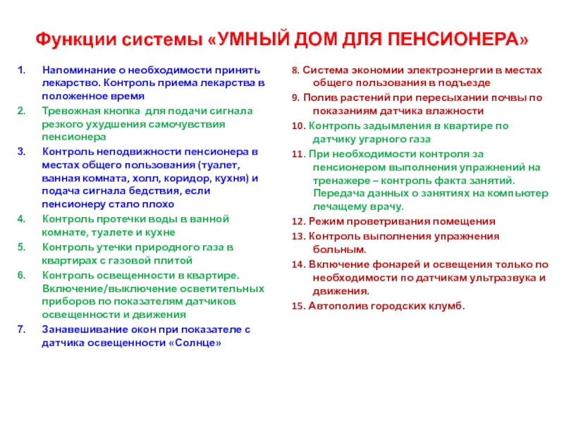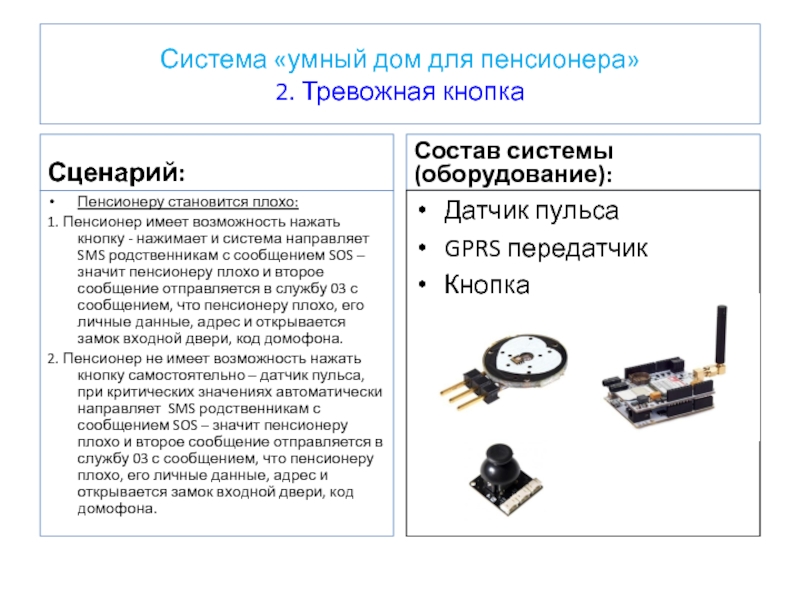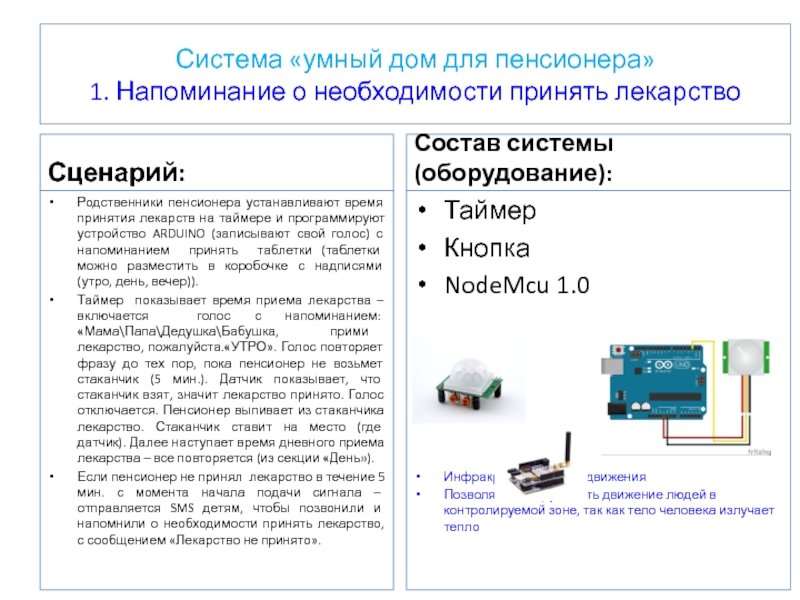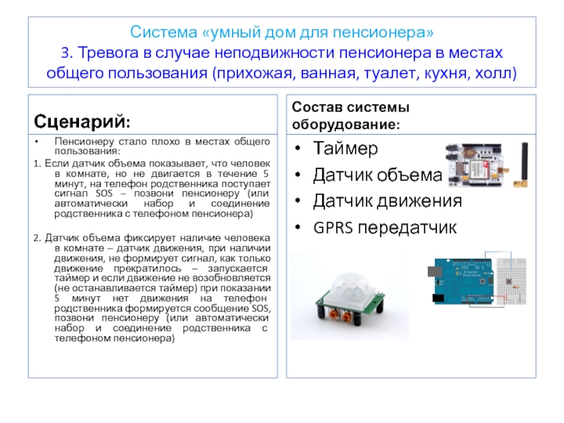 1. Если датчик объема показывает, что человек в комнате, но не двигается в течение 5 минут, на телефон родственника поступает сигнал SOS – позвони пенсионеру (или автоматически набор и соединение родственника с телефоном пенсионера)