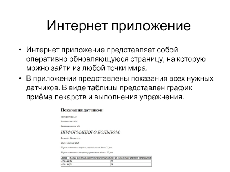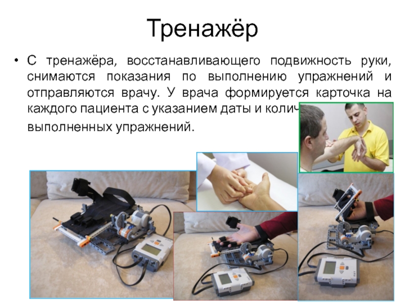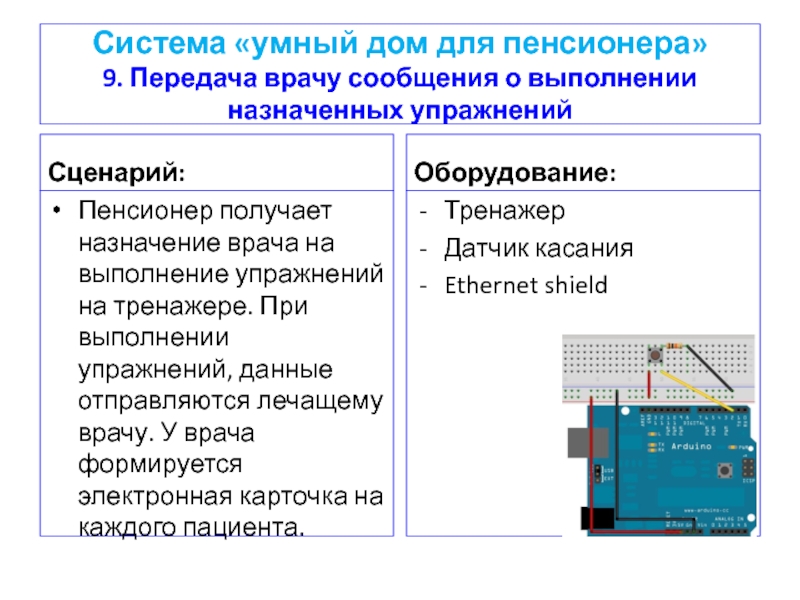 Пенсионер получает назначение врача на выполнение упражнений на тренажере. При выполнении упражнений, данные отправляются лечащему врачу. У врача формируется электронная карточка на каждого пациента.