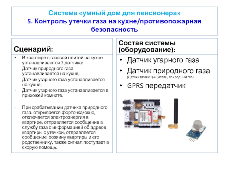 При срабатывании датчика природного газа: открывается форточка/окно, отключается электроэнергия в квартире, отправляется сообщение в службу газа с информацией об адресе квартиры с утечкой; отправляется сообщение хозяину квартиры и его родственнику, также сигнал поступает в скорую помощь.