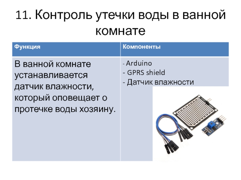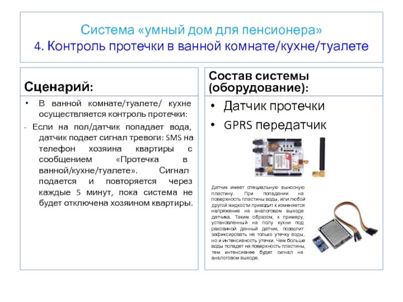 Датчик имеет специальную выносную пластину. При попадании на поверхность пластины воды, или любой другой жидкости приводит к изменяется напряжение на аналоговом выходе датчика. Таким образом, к примеру, установленный на полу кухни под раковиной данный датчик, позволит зафиксировать не только утечку воды, но и интенсивность утечки. Чем больше воды попадет на поверхность пластины, тем интенсивнее будет сигнал на аналоговом выходе.
