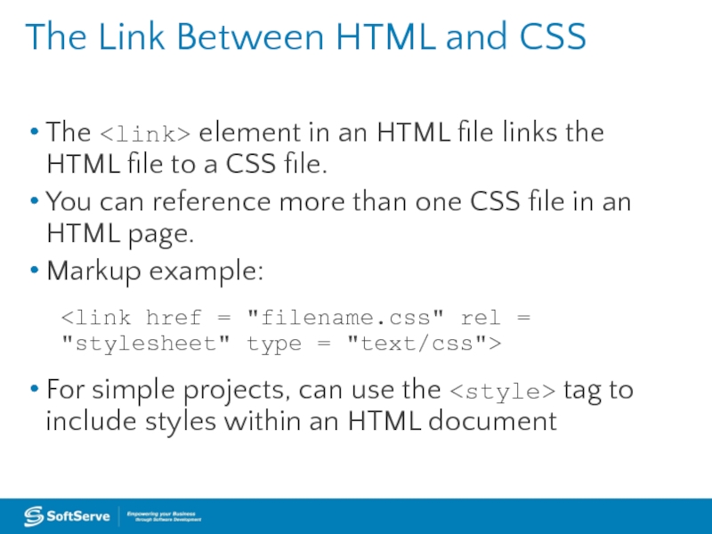 Слайд 6The Link Between HTML and CSS The element in an HTML