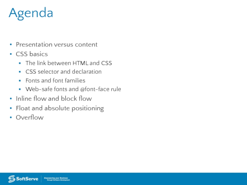Слайд 2Agenda Presentation versus content CSS basics The link between HTML and CSS CSS selector and