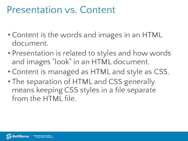 Слайд 3Presentation vs. Content Content is the words and images in an HTML