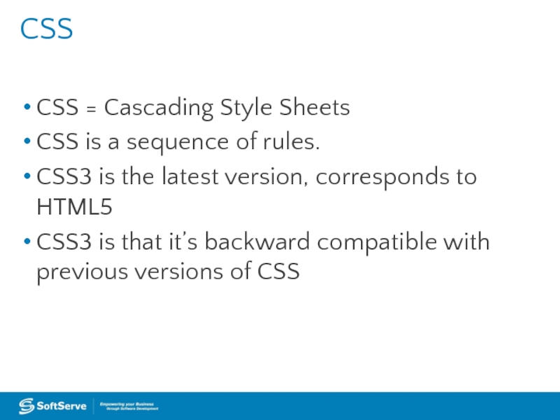 Слайд 4CSS CSS = Cascading Style Sheets CSS is a sequence of rules. CSS3 is