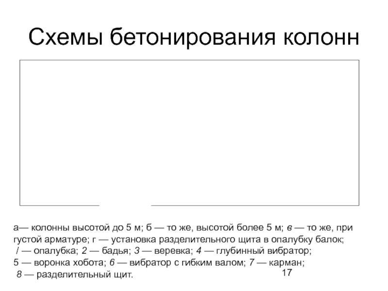 — то же, высотой более 3 м; / — опалубка; 2 — бадья; 3 — веревка; 4 — глубинный вибратор; 5 — воронка хобота; 9 — хобот.