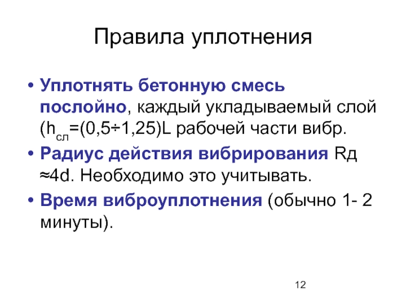 Уплотнять бетонную смесь послойно, каждый укладываемый слой (hсл=(0,5÷1,25)L рабочей части