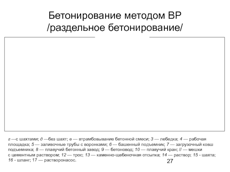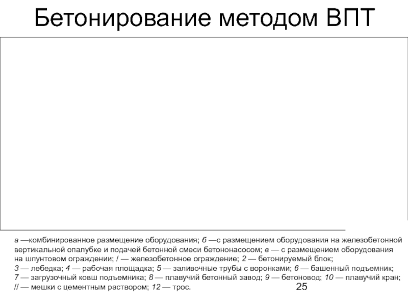 втрамбовывание бетонной смеси; 3 — лебедка; 4 — рабочая площадка; 5 — заливочные трубы с воронками; 6 — башенный подъемник; 7 — загрузочный ковш подъемника; 8 — плавучий бетонный завод; 9 — бетоновод; 10 — плавучий кран; // — мешки