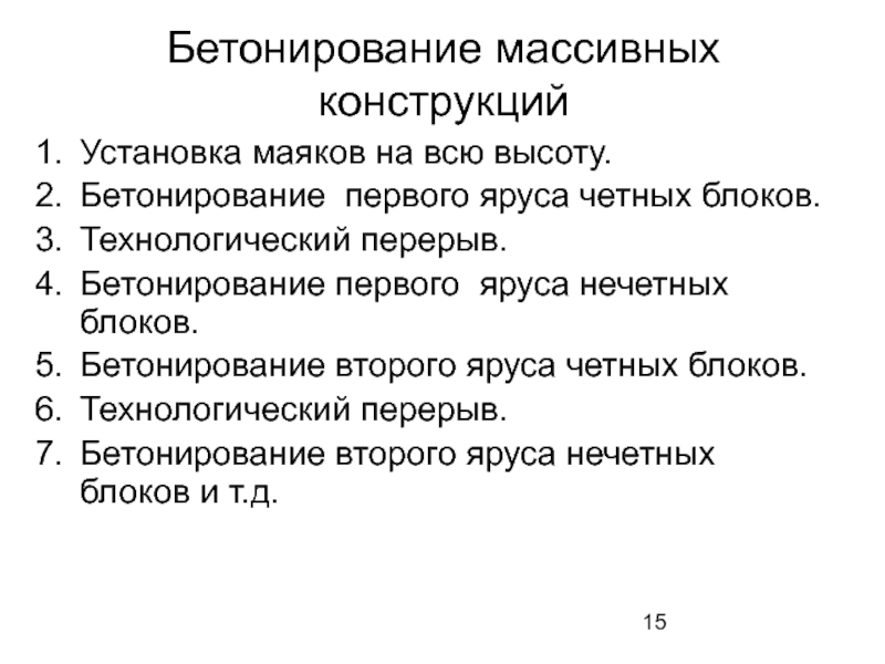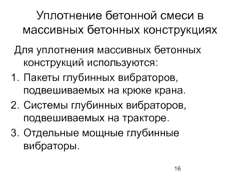 Слайд 16Уплотнение бетонной смеси в массивных бетонных конструкциях