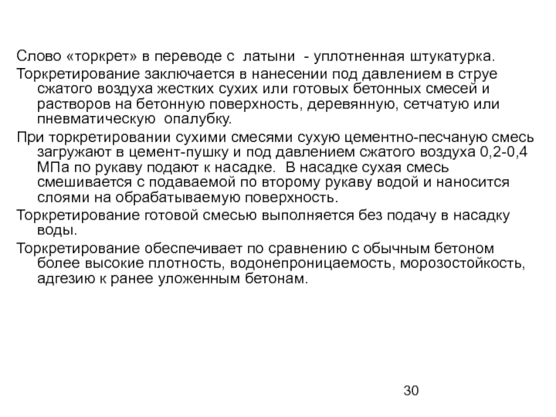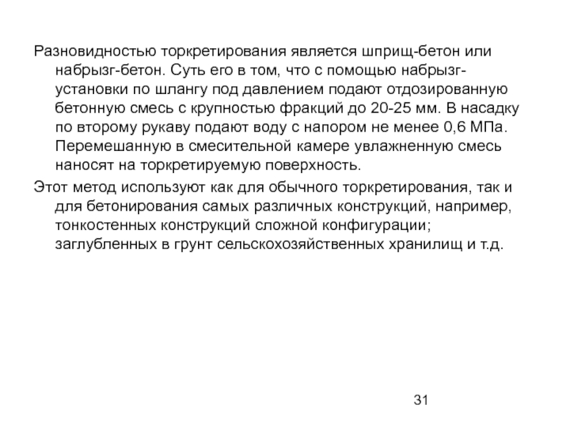 Слайд 31Разновидностью торкретирования является шприщ-бетон или набрызг-бетон. Суть его в том, что