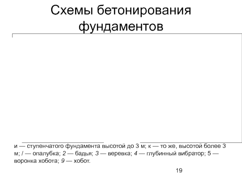 горизонтальными, // — наклонными слоями; /// — ступенями); м — плиты по подготовке; 2 — бадья; 12 — вибробрус;