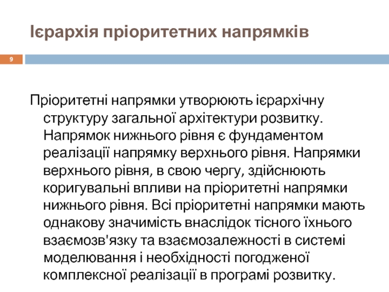 нижнього рівня є фундаментом реалізації напрямку верхнього рівня. Напрямки верхнього рівня, в свою чергу, здійснюють коригувальні впливи на пріоритетні напрямки нижнього рівня. Всі пріоритетні напрямки мають однакову значимість внаслідок тісного їхнього взаємозв'язку та взаємозалежності в системі моделювання і необхідності погодженої комплексної реалізації в програмі розвитку.