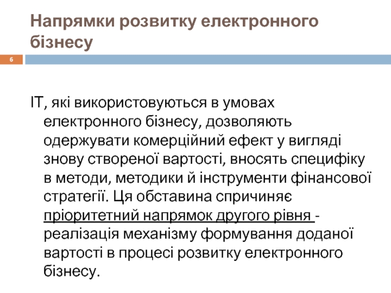 одержувати комерційний ефект у вигляді знову створеної вартості, вносять специфіку в методи, методики й інструменти фінансової стратегії. Ця обставина спричиняє пріоритетний напрямок другого рівня - реалізація механізму формування доданої вартості в процесі розвитку електронного бізнесу.