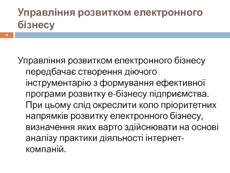 з формування ефективної програми розвитку е-бізнесу підприємства. При цьому слід окреслити коло пріоритетних напрямків розвитку електронного бізнесу, визначення яких варто здійснювати на основі аналізу практики діяльності інтернет-компаній.