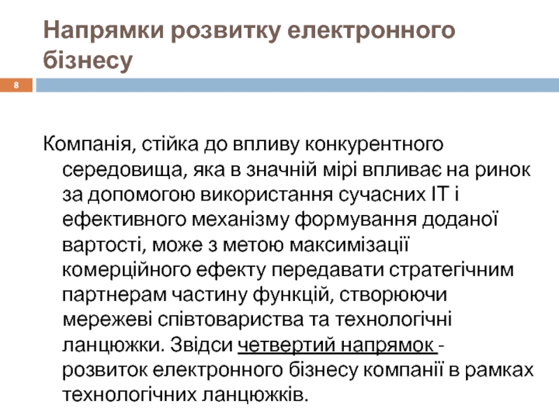 значній мірі впливає на ринок за допомогою використання сучасних ІТ і ефективного механізму формування доданої вартості, може з метою максимізації комерційного ефекту передавати стратегічним партнерам частину функцій, створюючи мережеві співтовариства та технологічні ланцюжки. Звідси четвертий напрямок - розвиток електронного бізнесу компанії в рамках технологічних ланцюжків.