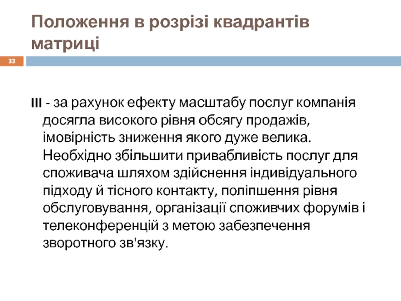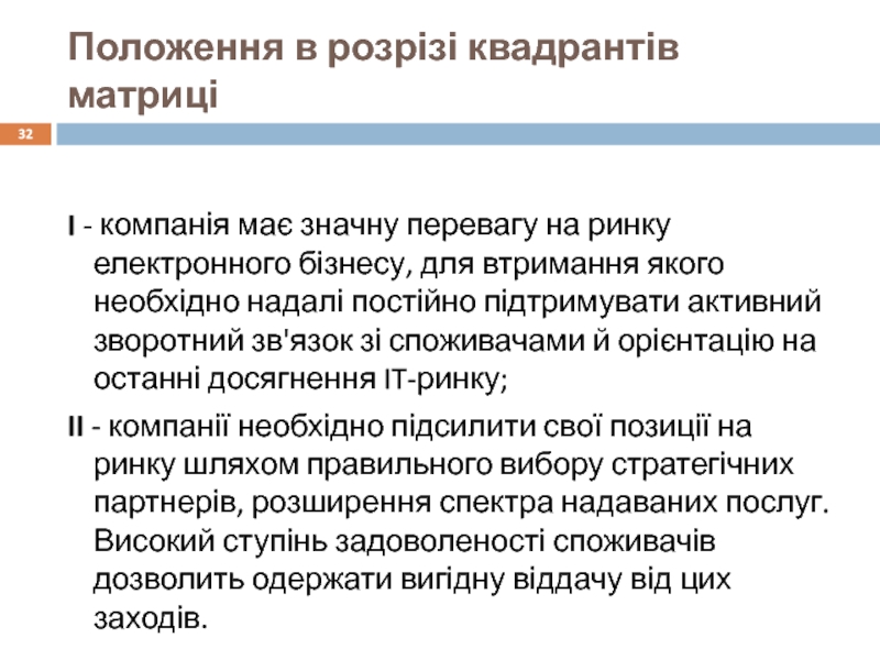 II - компанії необхідно підсилити свої позиції на ринку шляхом правильного вибору стратегічних партнерів, розширення спектра надаваних послуг. Високий ступінь задоволеності споживачів дозволить одержати вигідну віддачу від цих заходів.