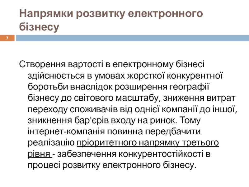 жорсткої конкурентної боротьби внаслідок розширення географії бізнесу до світового масштабу, зниження витрат переходу споживачів від однієї компанії до іншої, зникнення бар'єрів входу на ринок. Тому інтернет-компанія повинна передбачити реалізацію пріоритетного напрямку третього рівня - забезпечення конкурентостійкості в процесі розвитку електронного бізнесу.