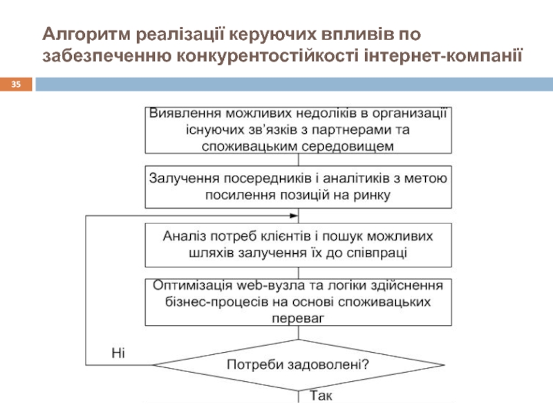 Слайд 35Алгоритм реалізації керуючих впливів по забезпеченню конкурентостійкості інтернет-компанії