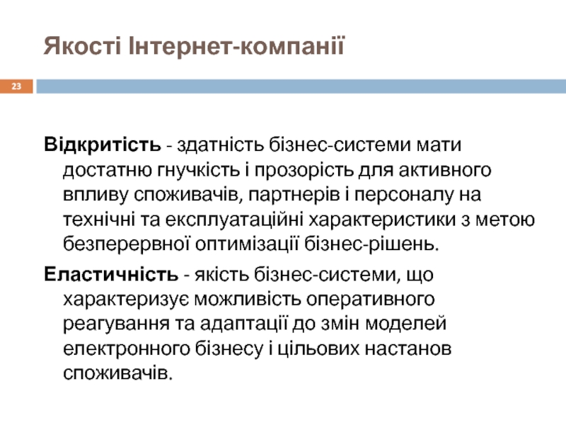 Еластичність - якість бізнес-системи, що характеризує можливість оперативного реагування та адаптації до змін моделей електронного бізнесу і цільових настанов споживачів.
