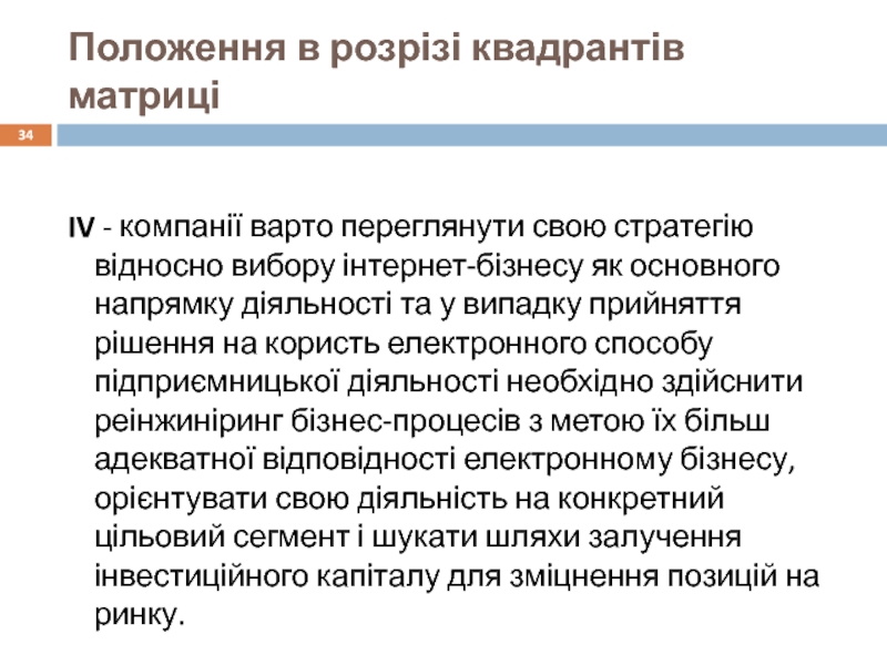відносно вибору інтернет-бізнесу як основного напрямку діяльності та у випадку прийняття рішення на користь електронного способу підприємницької діяльності необхідно здійснити реінжиніринг бізнес-процесів з метою їх більш адекватної відповідності електронному бізнесу, орієнтувати свою діяльність на конкретний цільовий сегмент і шукати шляхи залучення інвестиційного капіталу для зміцнення позицій на ринку.