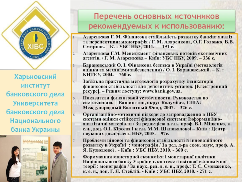 Азаренкова Г. М. Фінансова стабільність розвитку банків: аналіз та перспективи: монографія / Г. М. Азаренкова, О.Г. Головко, В.В. Смирнов. – К. : УБС НБУ, 2011. – 191 с.