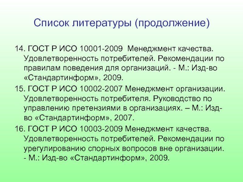16. ГОСТ Р ИСО 10003-2009 Менеджмент качества. Удовлетворенность потребителей. Рекомендации по урегулированию спорных вопросов вне организации. - М.: Изд-во «Стандартинформ», 2009.