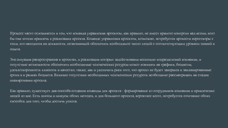 не имеет прямого контроля над всеми, кого бы они хотели привлечь к реализации проекта. Команде управления проектом, возможно, потребуется провести переговоры с теми, кто находится на должности, позволяющей обеспечить необходимое число людей с соответствующим уровнем знаний и опыта.