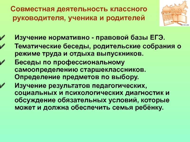 Слайд 24Совместная деятельность классного руководителя, ученика и родителей