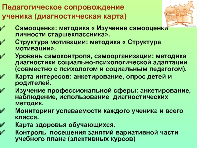 Слайд 22Педагогическое сопровождение ученика (диагностическая карта)