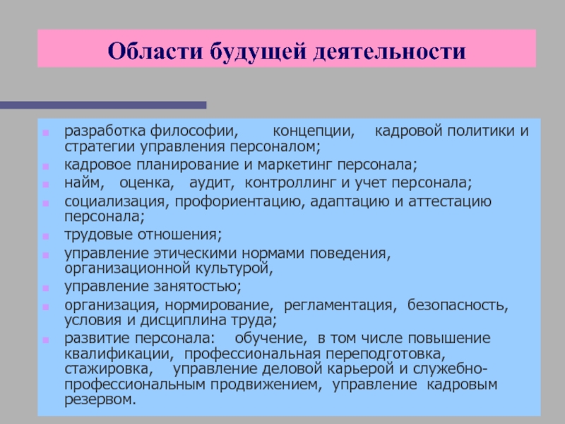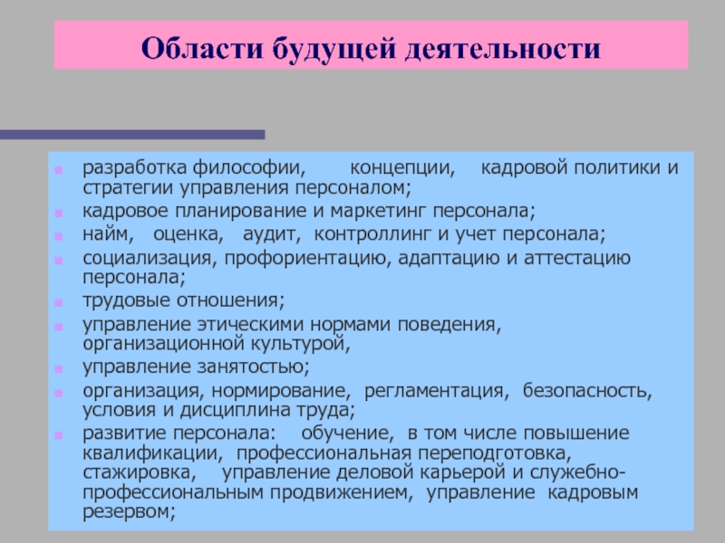 развитие персонала: обучение, в том числе повышение квалификации, профессиональная переподготовка, стажировка, управление деловой карьерой и служебно-профессиональным продвижением, управление кадровым резервом.